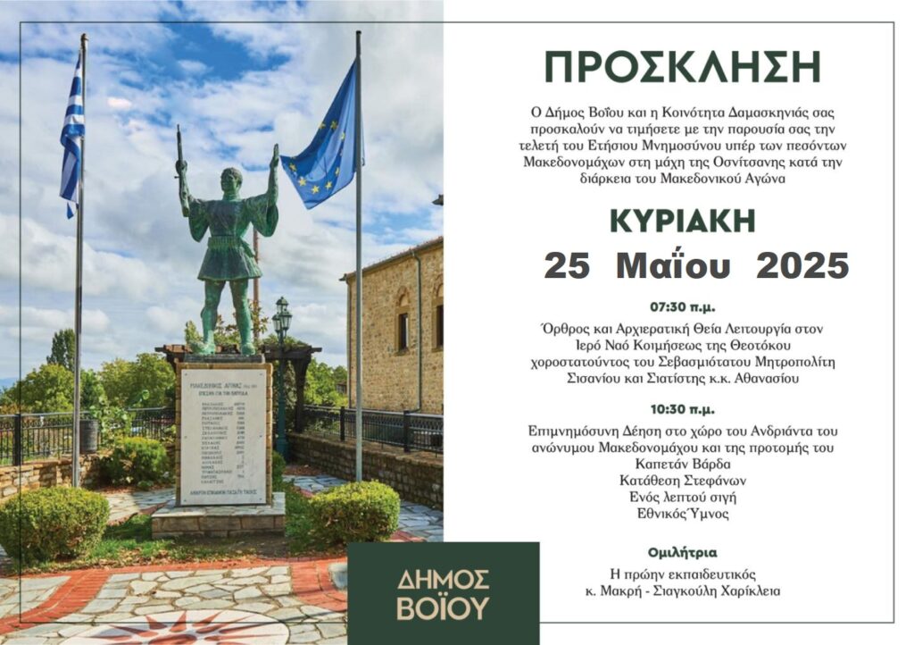 Εκδήλωση για τον εορτασμό της Μάχης της Οσνίτσανης, διοργανώνουν την Κυριακή 25 Μαΐου 2025 στην Δαμασκηνιά, ο Δήμος Βοΐου και η Κοινότητα Δαμασκηνιάς.