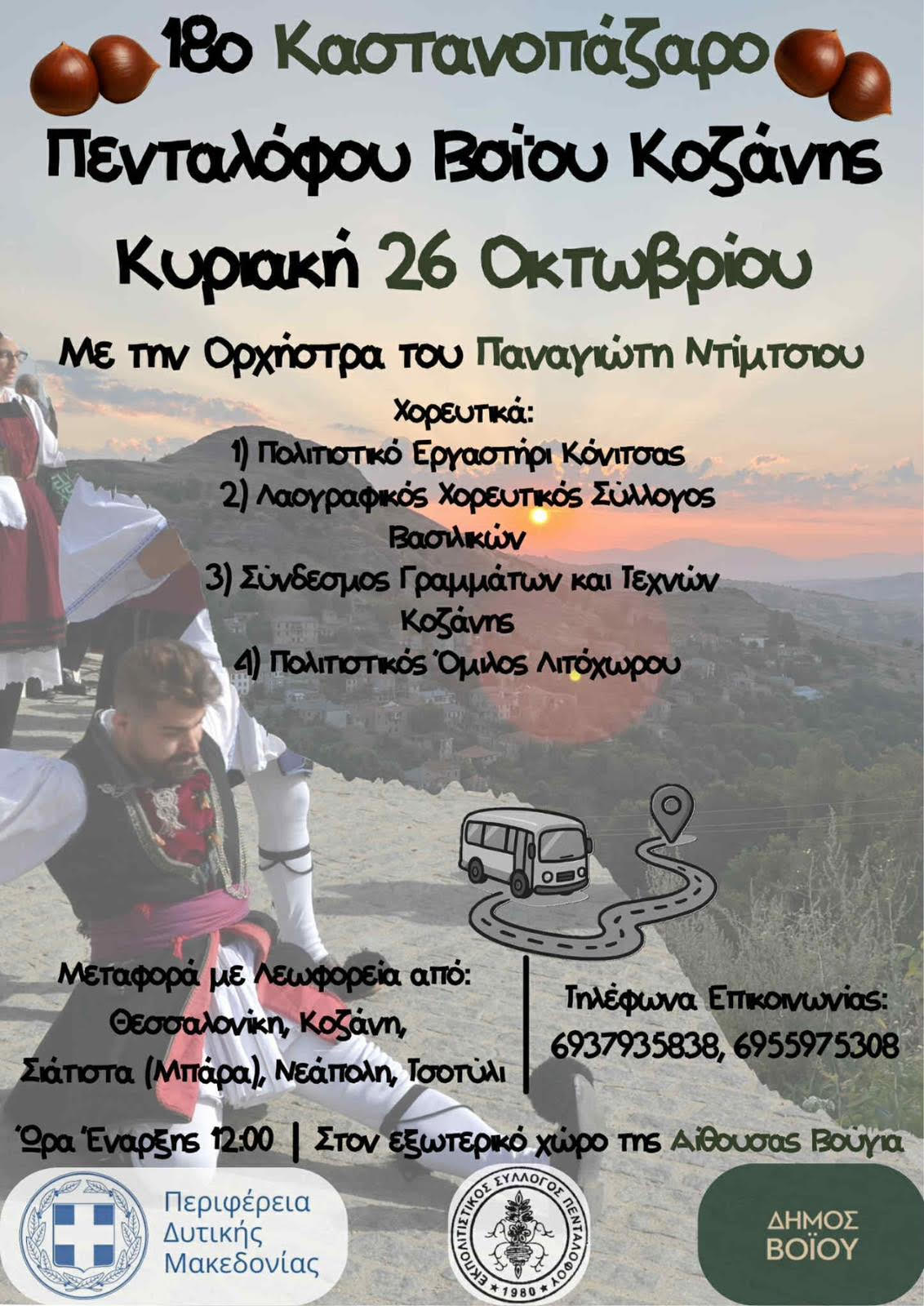 Συμμετέχουν τα χορευτικά: Πολιτιστικό Εργαστήρι Κόνιτσας, Λαογραφικός Χορευτικός Σύλλογος Βασιλικών, Σύνδεσμος Γραμμάτων και Τεχνών Κοζάνης και Πολιτιστικός Όμιλος Λιτόχωρου